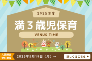 令和7年度満3歳児クラス「Venus Time」(Preschool(年少:Gaiaクラス)に入園する前の年齢のお子さま対象)のご案内です。次年度の4月を待たず幼稚園生活を始めることが可能となります。3歳頃になると同年齢のお友だちへの関心がめばえてきますので、少しずつお友だちとの関わりを育み、ご家庭と連携しお子さまの成長を見守りながらPreschool入園に向けて園生活の準備をしていきましょう。詳細は、2025年度VENUS TIME入園案内をご覧下さい。(入園願書配布5月1日より)