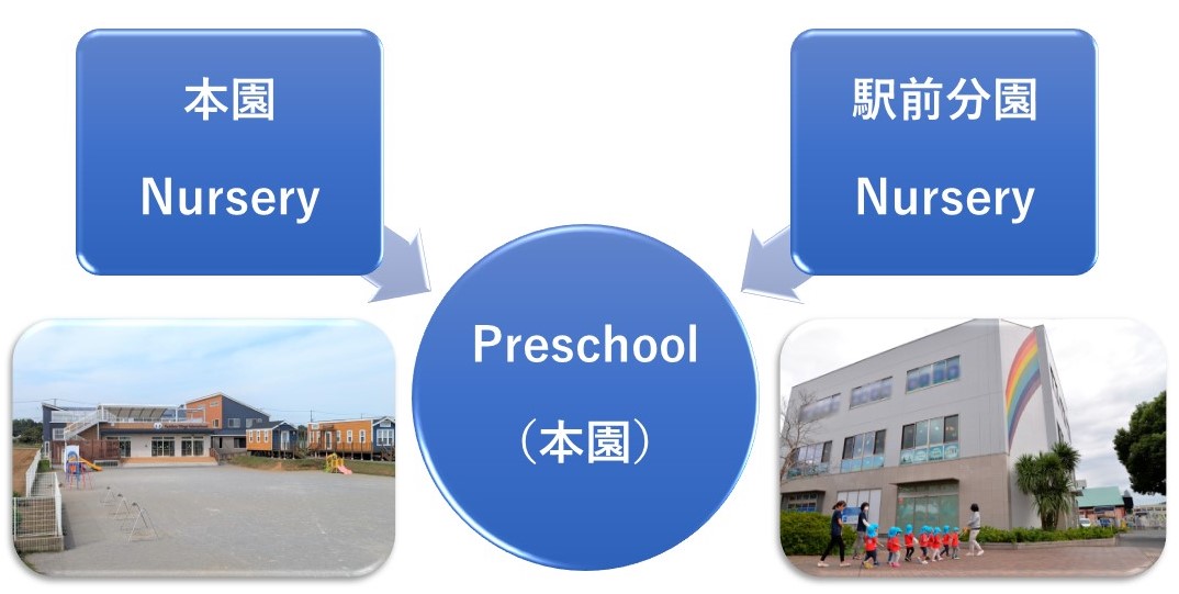 Nurseryは、本園と駅前分園の2か所から選ぶことができます。どちらも希望すれば本園にあるPreschool3歳児クラスへの進級することができます。お住まいのエリアや、通勤等の利便性に合わせ、ご希望の施設をお選びください。